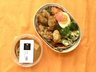 もちもちの発芽玄米ごはん、たっぷりの野菜のおかず、かつお出汁の効いた野菜の出汁びたしが美味しいお弁当です